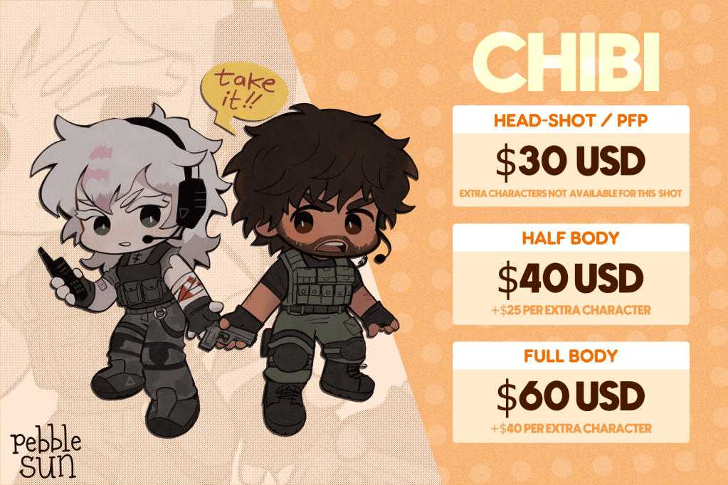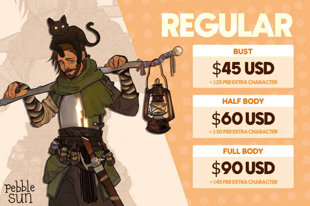 Note: Exact pricing may vary depending on complexity of the drawing, amount of background detail desired, whether there is pre-existing visual reference for the subject of the piece, and nature of the drawing (nsfw/sfw/etc).